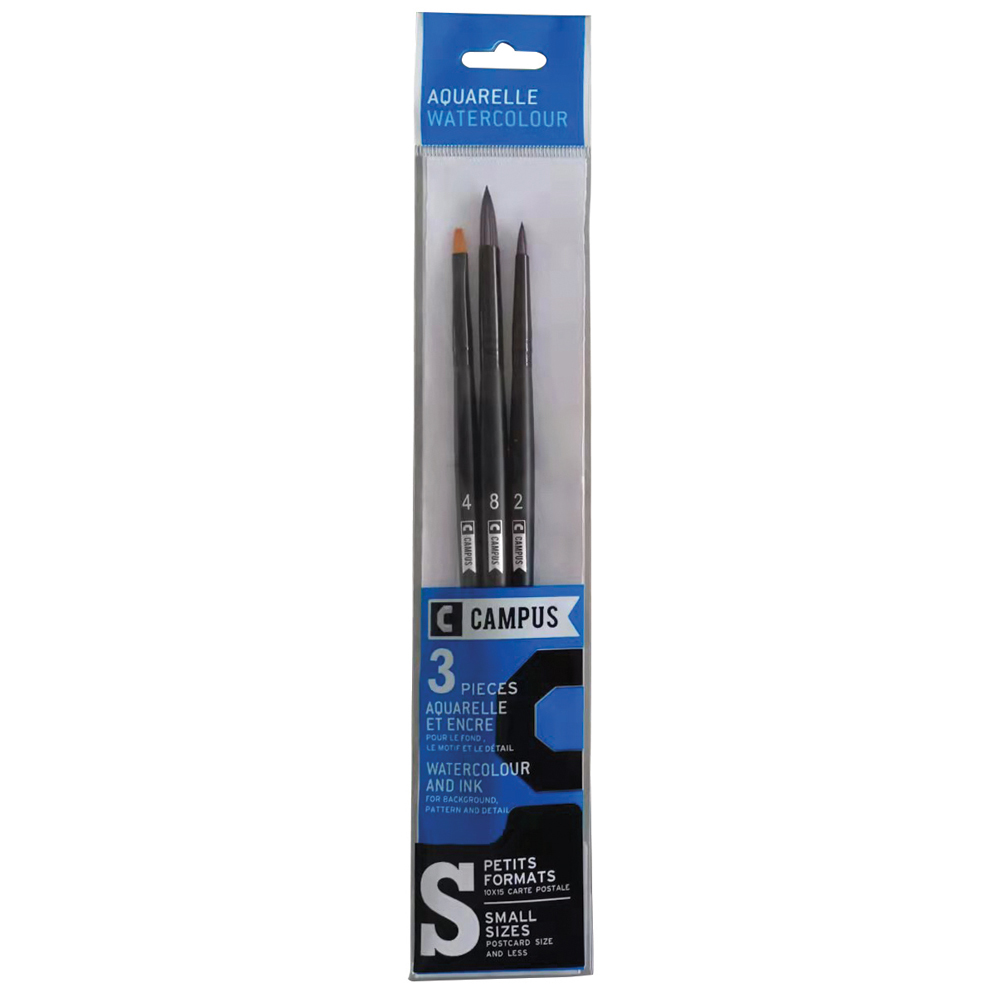 Set of 3 long handle synthetic brushes for watercolour and gouache. Hang sell blue packaging. 1 flat and 2 round brushes in 4 sizes.